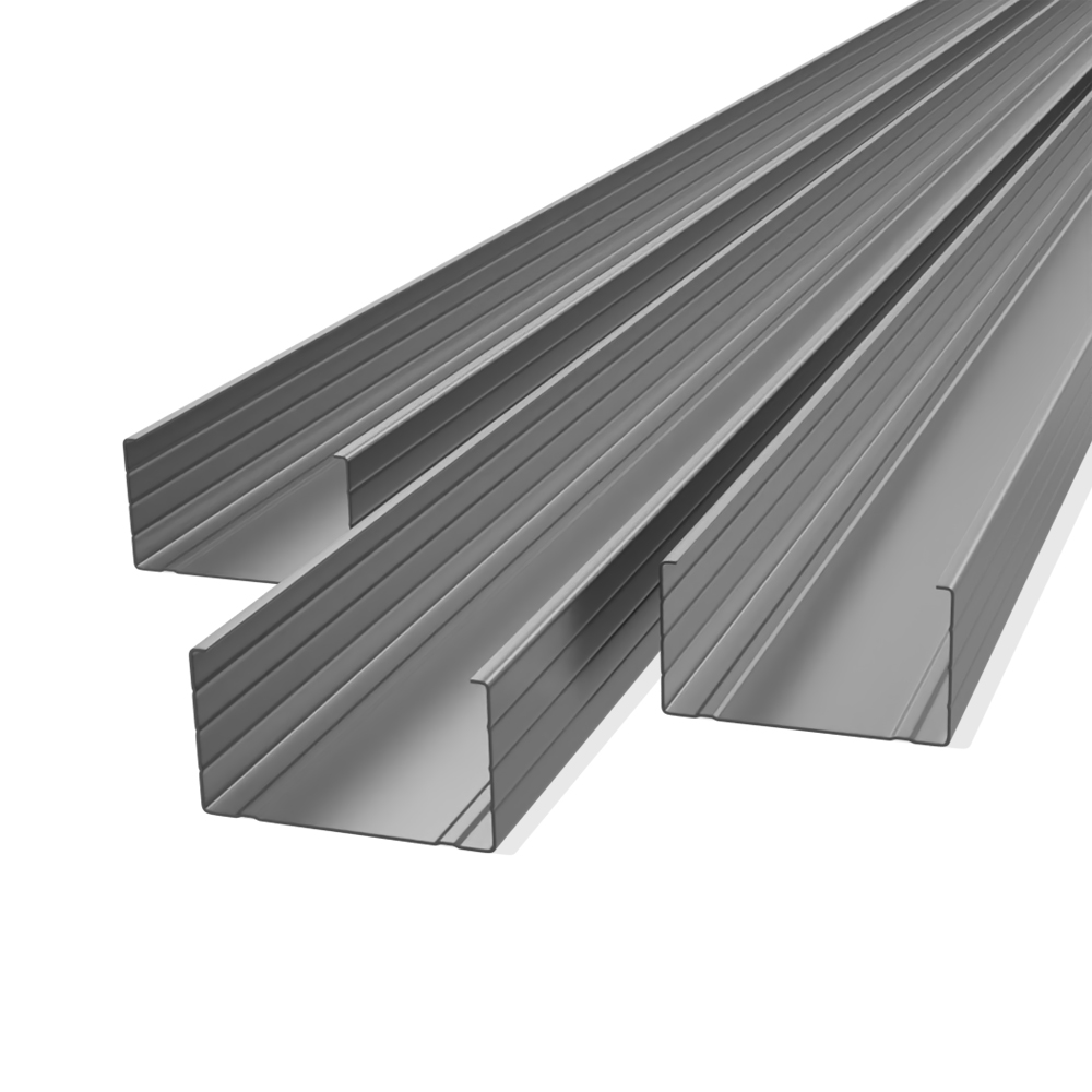 Профиль стоечный направляющий – П-образный крепежный элемент для формирования вертикальных каркасов. Производители выпускают профили разной ценовой категории. В основном их изготавливают из недорогой рулонной горячеоцинкованной стали (обычной марок Ст3, Ст5 разной степени раскисления сп/пс/кп или из качественной малоуглеродистой 08кп). Реже используется необработанная стальная лента, требующая гальванической оцинковки или грунтования, а также штрипс из различных алюминиевых сплавов (дюралей) или полосный нержавеющий металл (для особых условий эксплуатации).