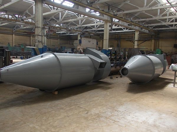 Конструкция циклонов спиральная, коническая. Она имеет большую энергоемкость, в то же время характеризуется большей эффективностью при использовании в целях необходимости обеспечить очистку газов от мелкой пыли, в условиях необходимости размещения на небольшой территории.