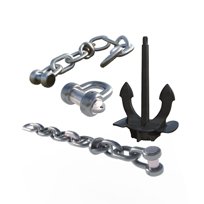 Поставку якорной цепи с комплектующими можно осуществить с якорями: Холта с поворотными лапами, SPEK, отличающийся высокой держащей силой, другими моделями. Масса якоря: от 50 кг до 32 т.